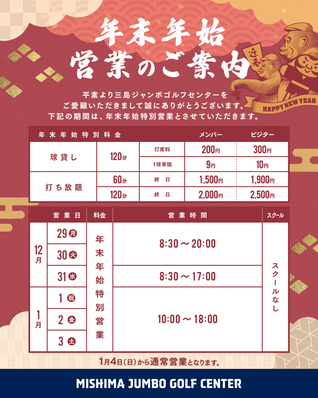 平素より、三島ジャンボゴルフセンターをご利用いただき、誠にありがとうございます。